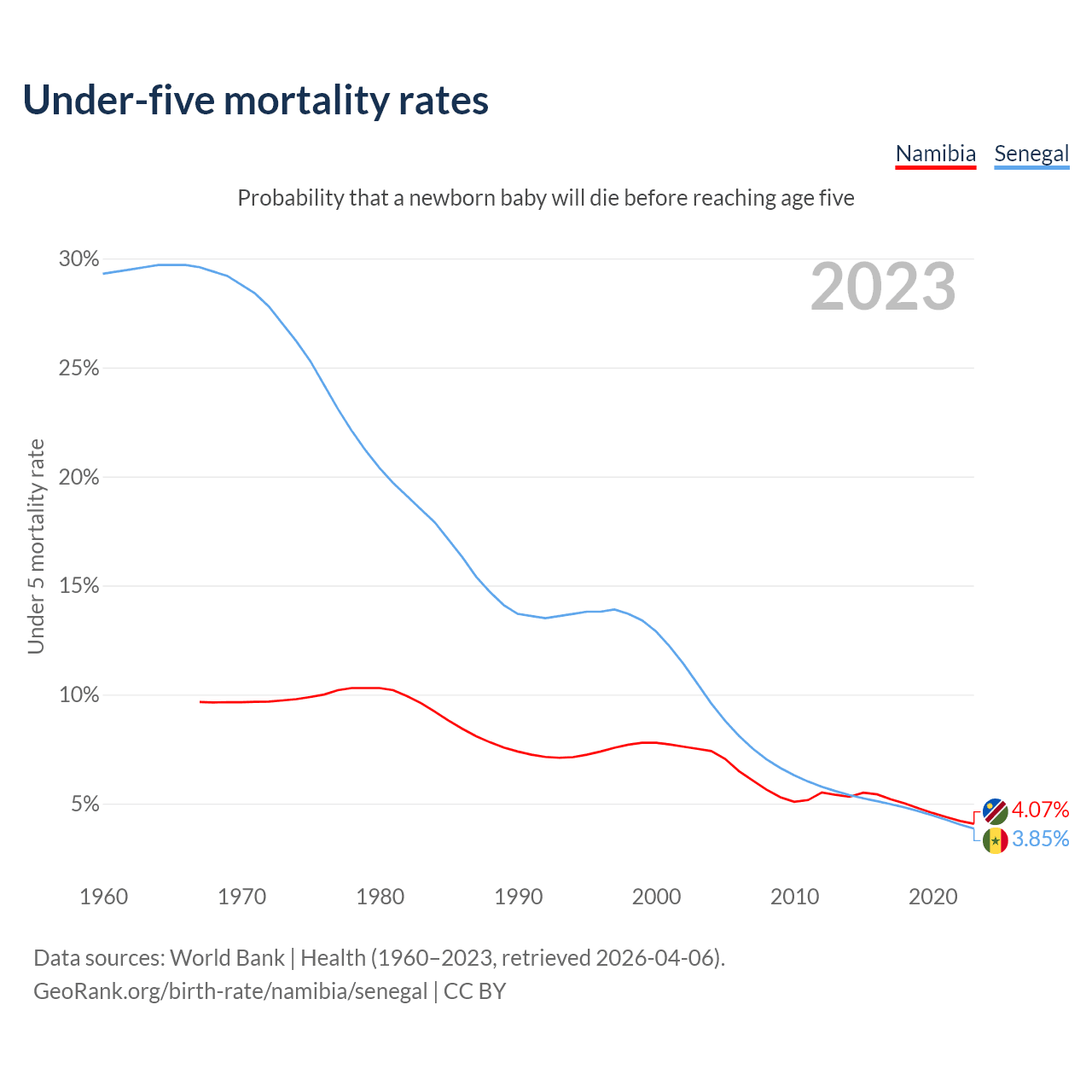 The chance that a newborn baby will die before reaching age five is 4.07% in Namibia and 3.85% in Senegal. Above is a chart with historical data on under-five mortality rates.