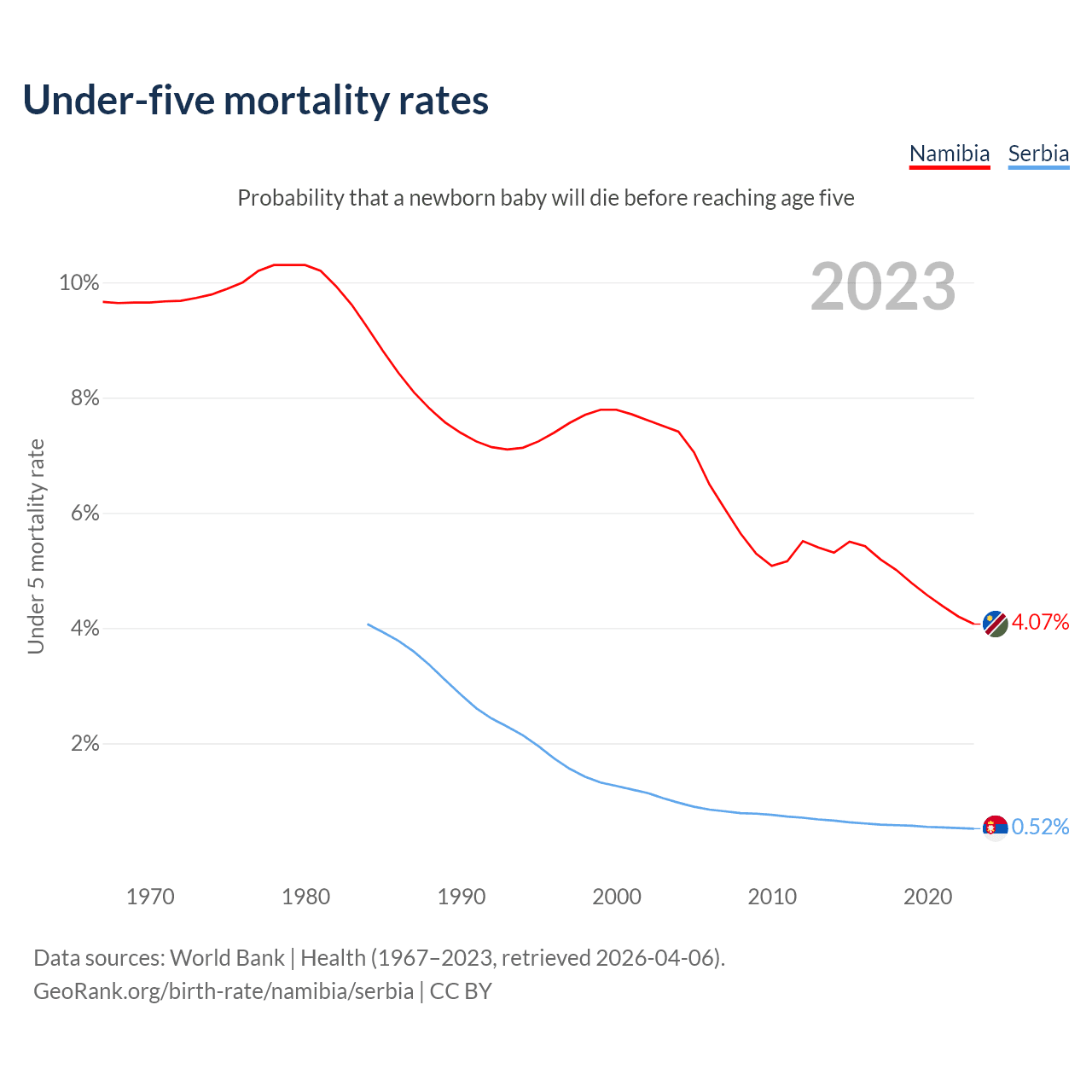 The chance that a newborn baby will die before reaching age five is 4.07% in Namibia and 0.52% in Serbia. Above is a chart with historical data on under-five mortality rates.