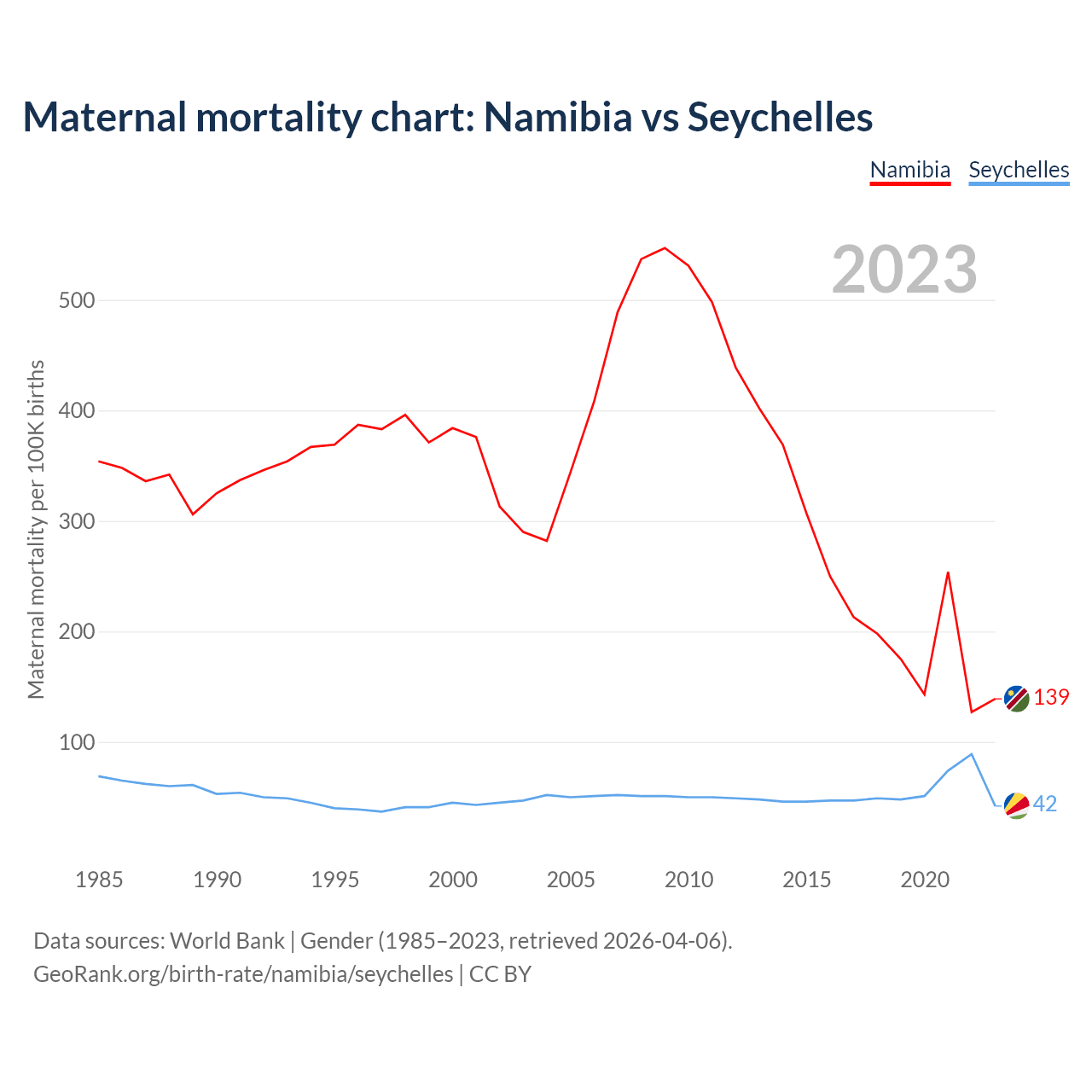 The maternal mortality rate, which is the probability of dying during childbirth or within 42 days of pregnancy termination, is 139 deaths per 100,000 live births in Namibia, compared to 42 deaths in the Seychelles.