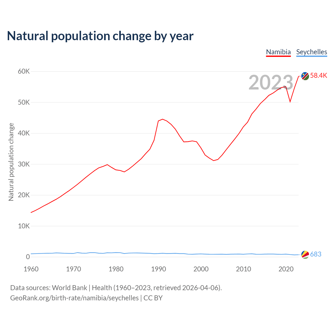 According to the latest available data on birth rates, the fertility rate in Namibia was 3.21 children per woman in 2023, compared to 2.02 in the Seychelles in 2023. The replacement level is considered to be 2.1 children per woman.