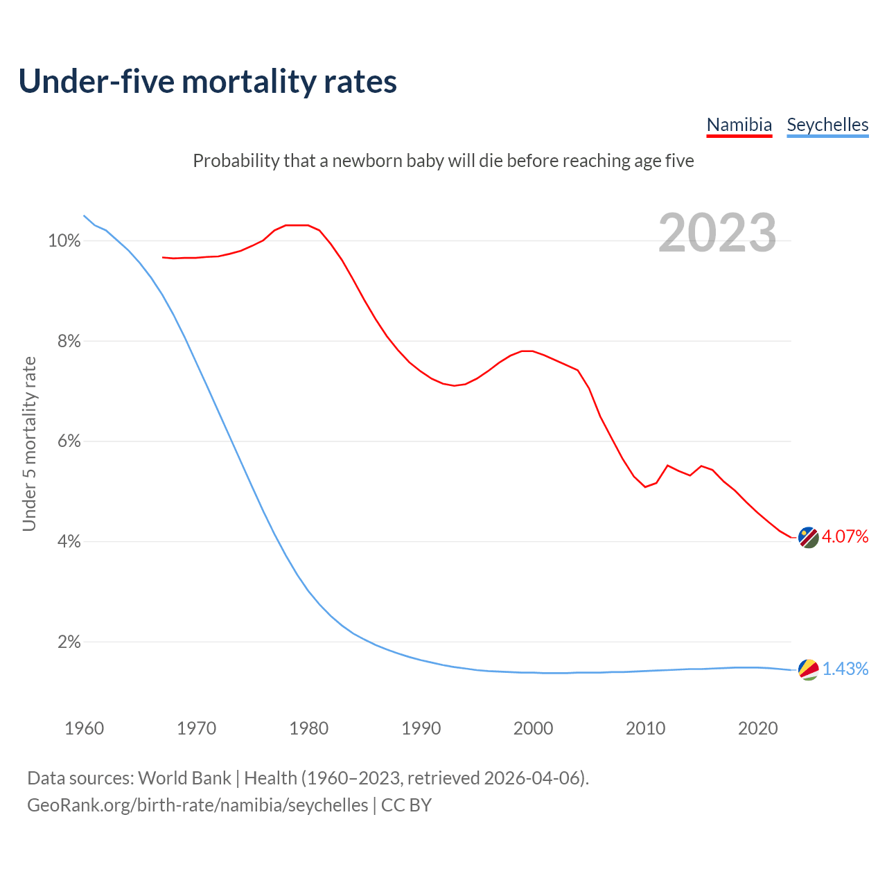 The chance that a newborn baby will die before reaching age five is 4.07% in Namibia and 1.43% in the Seychelles. Above is a chart with historical data on under-five mortality rates.