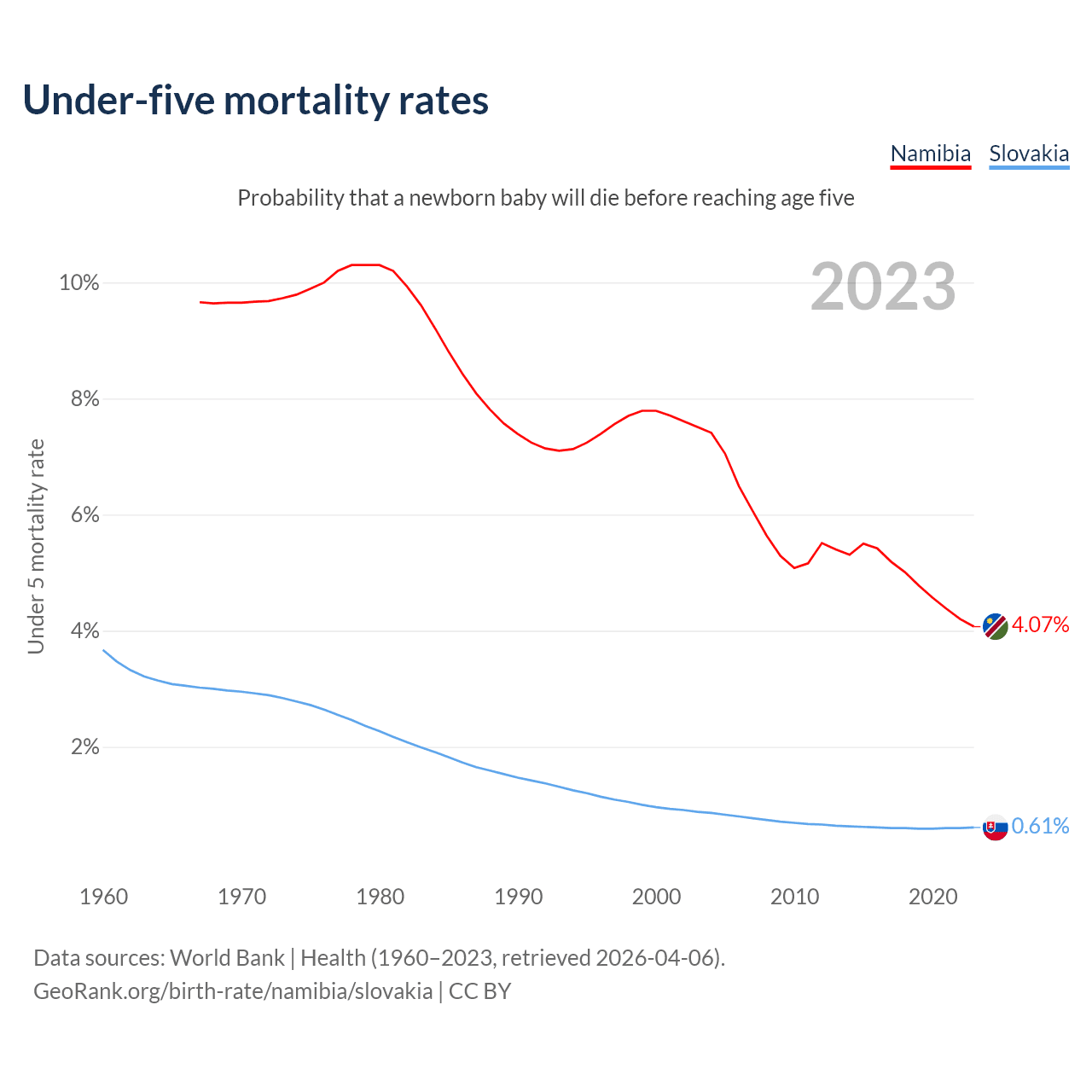 The chance that a newborn baby will die before reaching age five is 4.07% in Namibia and 0.61% in Slovakia. Above is a chart with historical data on under-five mortality rates.