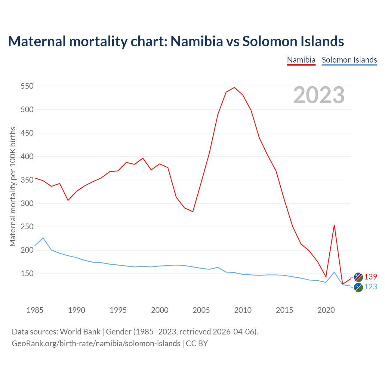 The maternal mortality rate, which is the probability of dying during childbirth or within 42 days of pregnancy termination, is 139 deaths per 100,000 live births in Namibia, compared to 123 deaths in the Solomon Islands.
