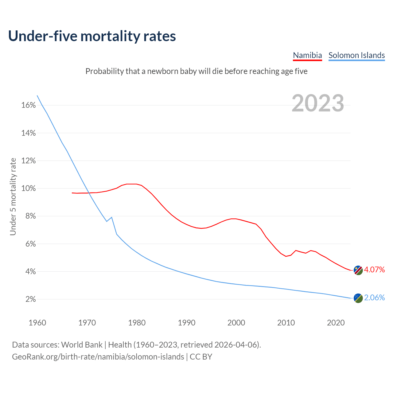 The chance that a newborn baby will die before reaching age five is 4.07% in Namibia and 2.06% in the Solomon Islands. Above is a chart with historical data on under-five mortality rates.