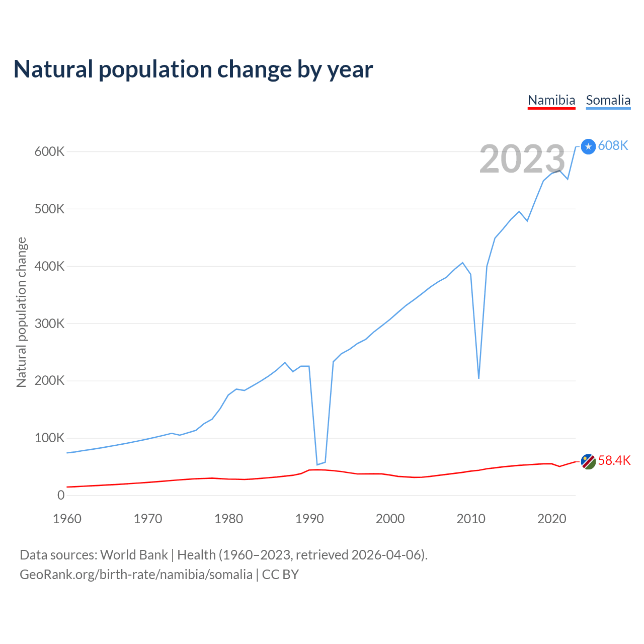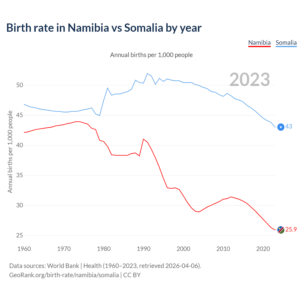 Namibia has an annual birth rate of 25.9 births per 1,000 people, compared to 43 for Somalia. The average number of children a woman is expected to have during her lifetime — the fertility rate, is 3.21 in Namibia and 6.13 in Somalia — 90.9% difference.