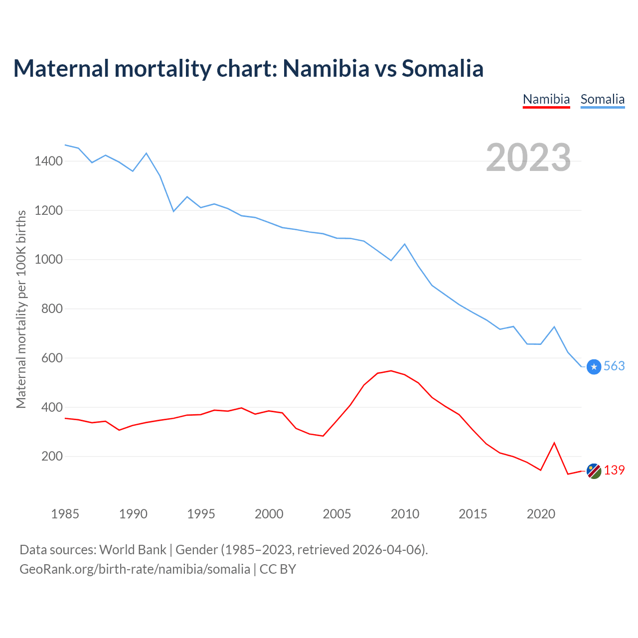 The maternal mortality rate, which is the probability of dying during childbirth or within 42 days of pregnancy termination, is 139 deaths per 100,000 live births in Namibia, compared to 563 deaths in Somalia.