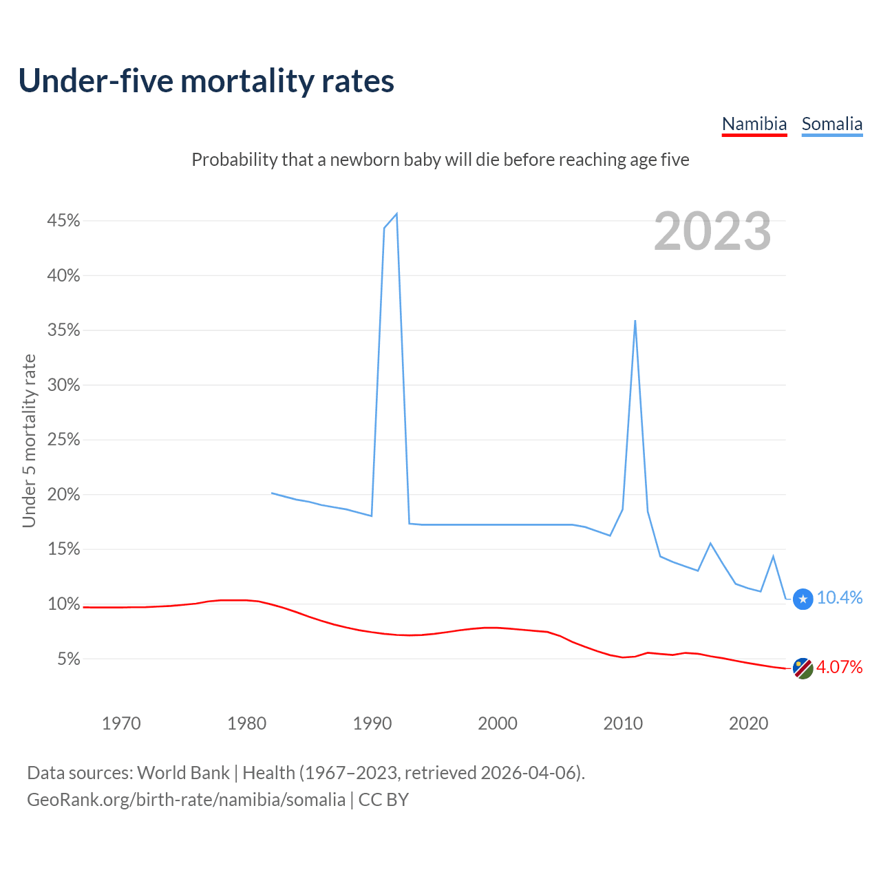 The chance that a newborn baby will die before reaching age five is 4.07% in Namibia and 10.4% in Somalia. Above is a chart with historical data on under-five mortality rates.