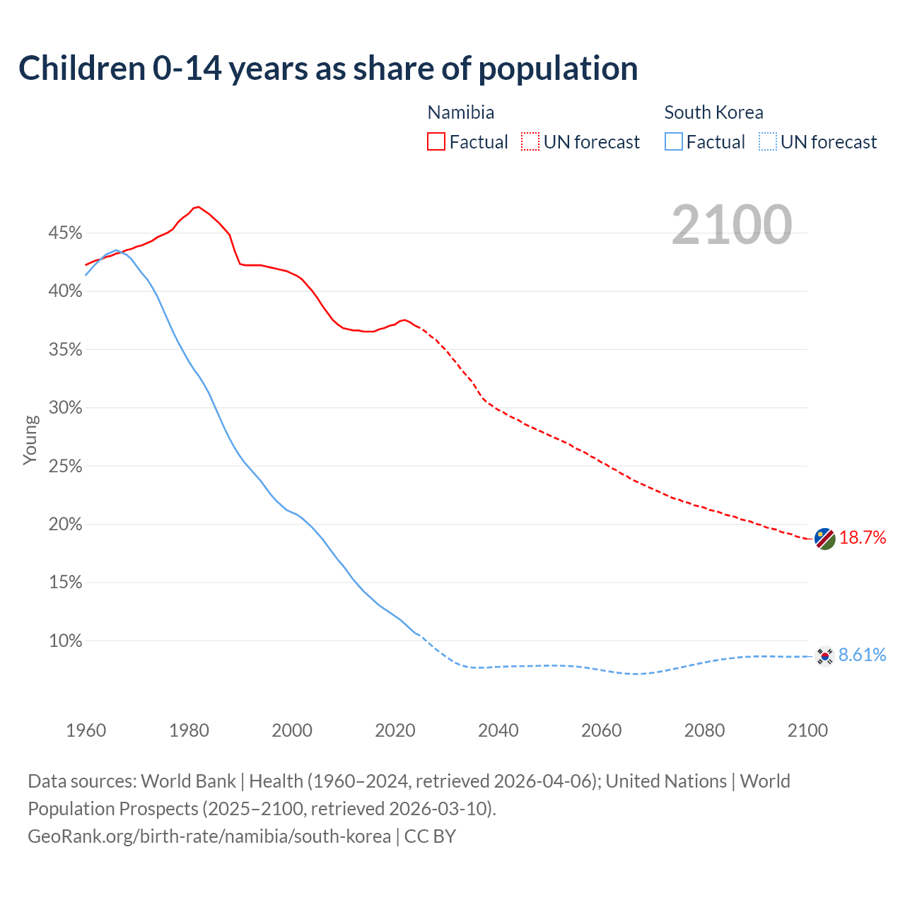 According to the latest available data on birth rates, the fertility rate in Namibia was 3.21 children per woman in 2023, compared to 0.72 in South Korea in 2023. The replacement level is considered to be 2.1 children per woman.