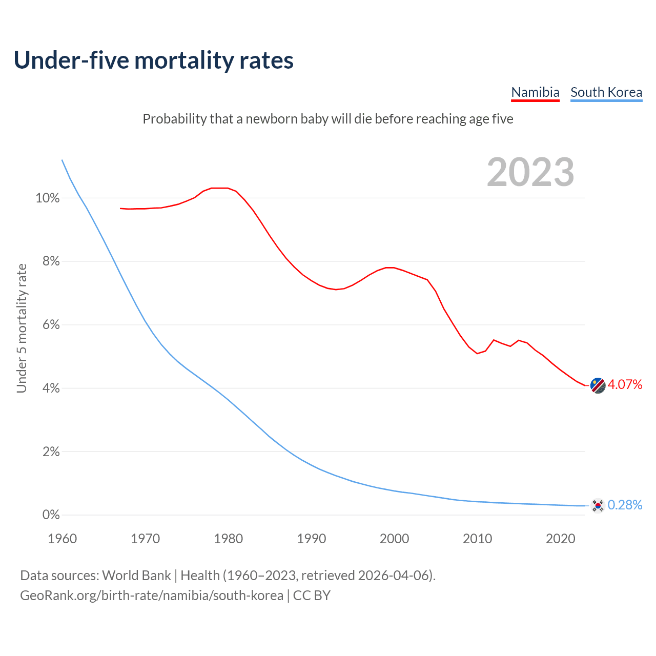The chance that a newborn baby will die before reaching age five is 4.07% in Namibia and 0.28% in South Korea. Above is a chart with historical data on under-five mortality rates.
