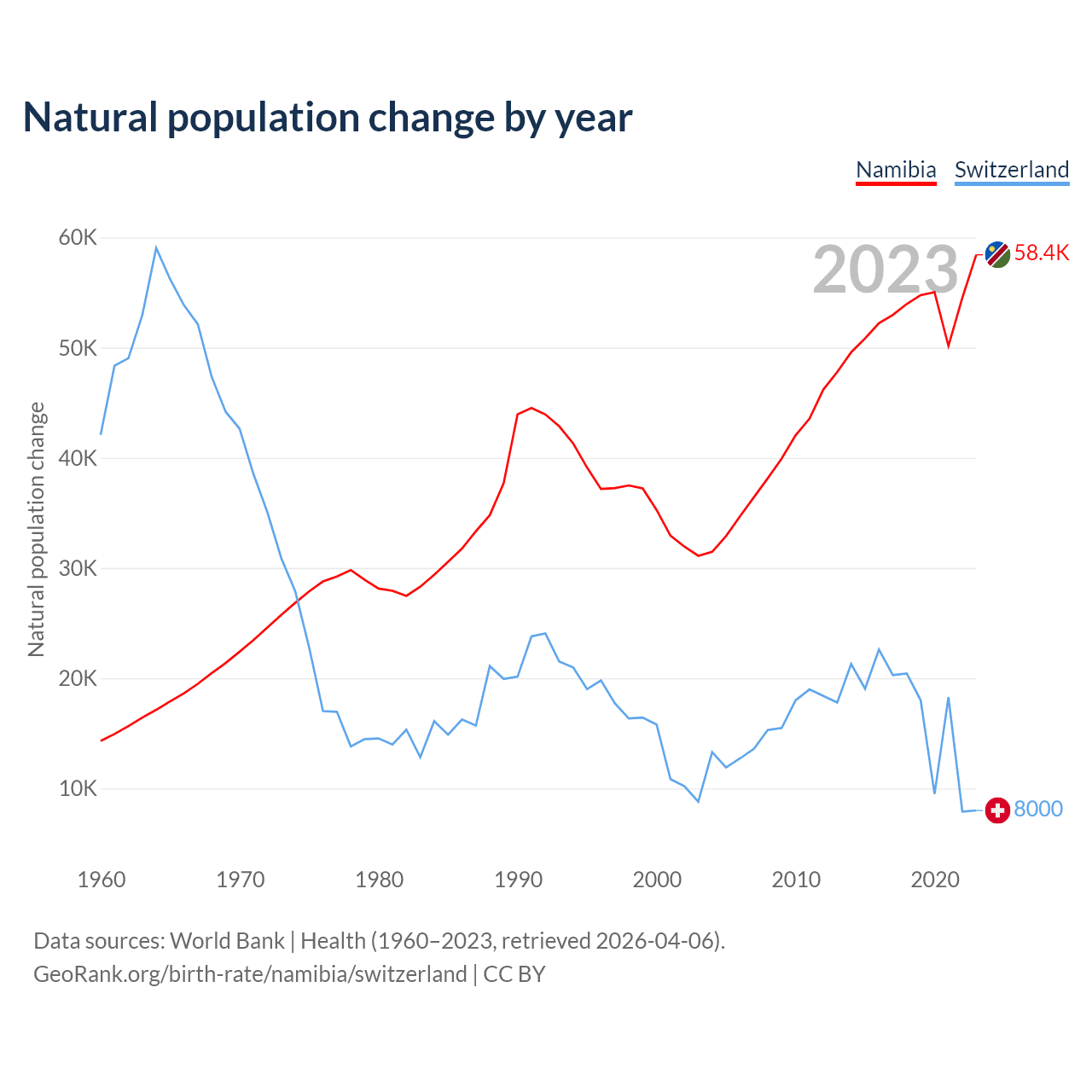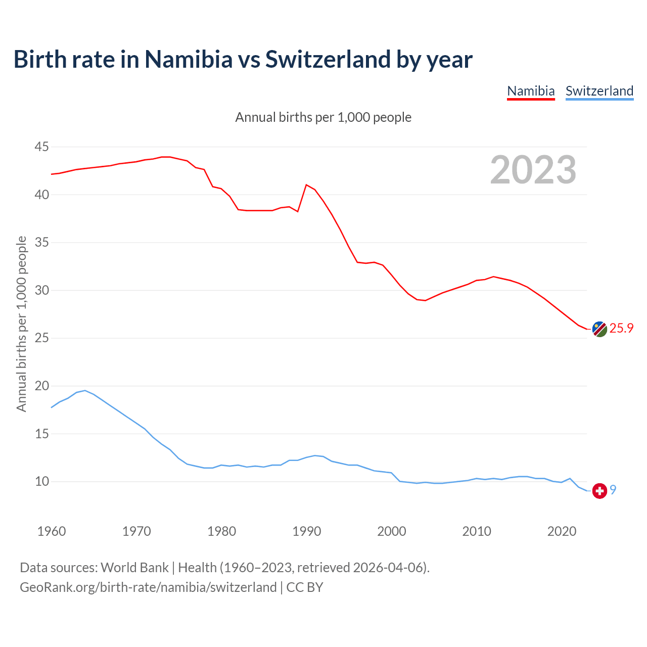 Namibia has an annual birth rate of 25.9 births per 1,000 people, compared to 9 for Switzerland. The average number of children a woman is expected to have during her lifetime — the fertility rate, is 3.21 in Namibia and 1.33 in Switzerland — 58.6% difference.