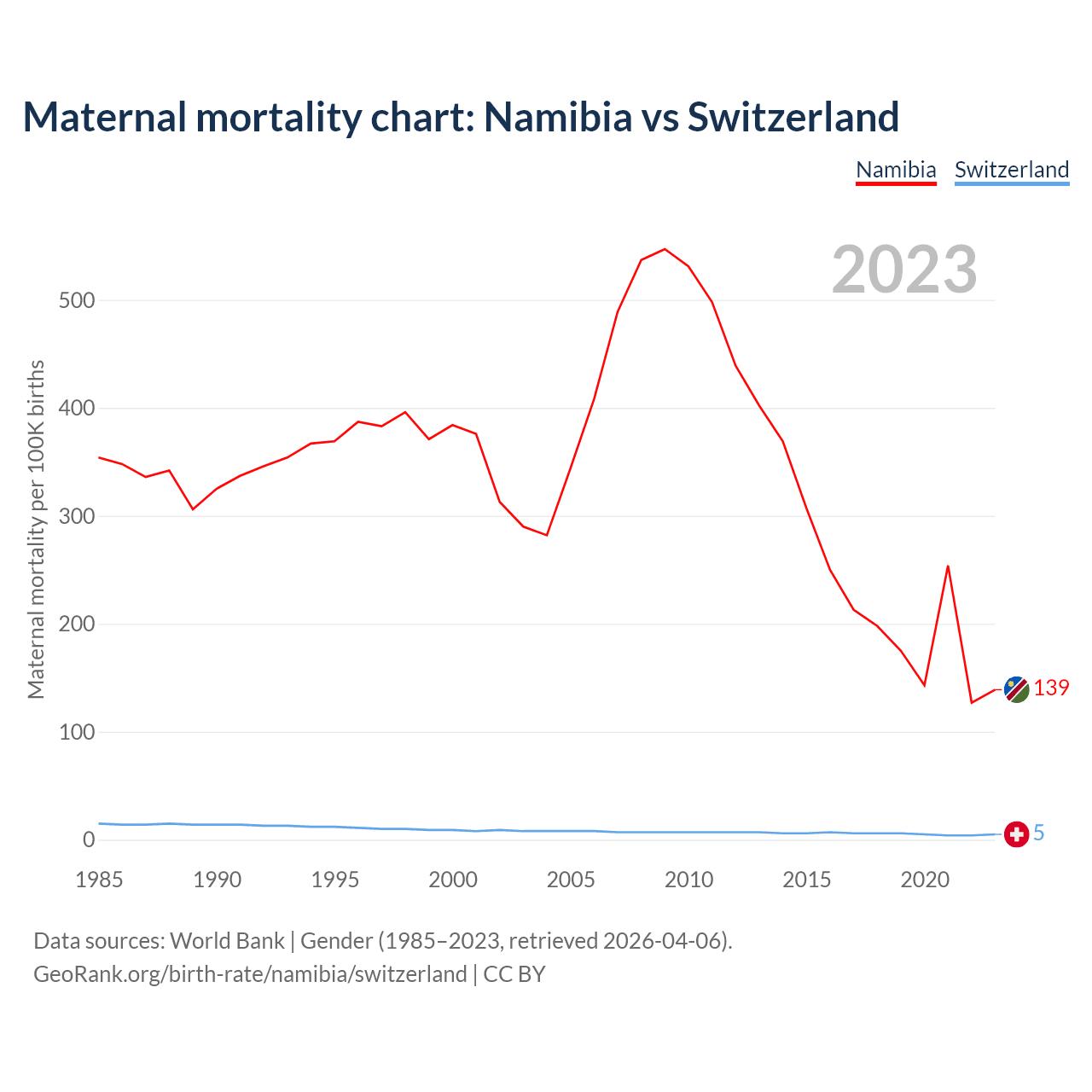 The maternal mortality rate, which is the probability of dying during childbirth or within 42 days of pregnancy termination, is 139 deaths per 100,000 live births in Namibia, compared to 5 deaths in Switzerland.