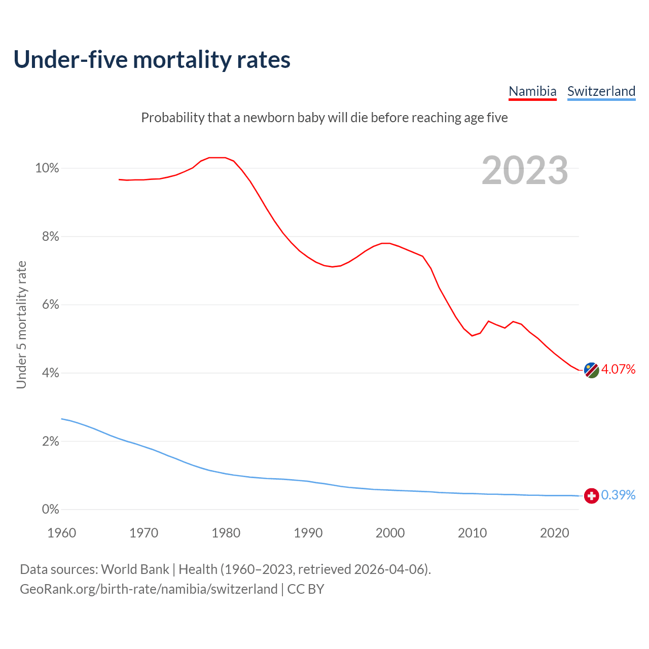 The chance that a newborn baby will die before reaching age five is 4.07% in Namibia and 0.39% in Switzerland. Above is a chart with historical data on under-five mortality rates.