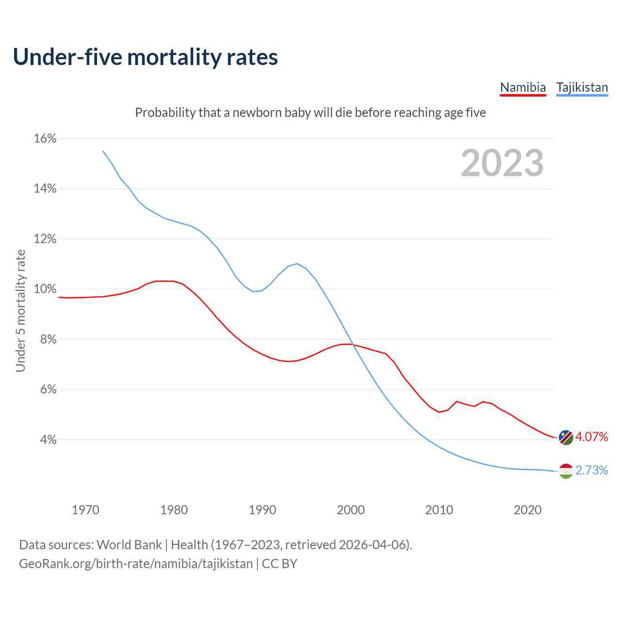 The chance that a newborn baby will die before reaching age five is 4.07% in Namibia and 2.73% in Tajikistan. Above is a chart with historical data on under-five mortality rates.
