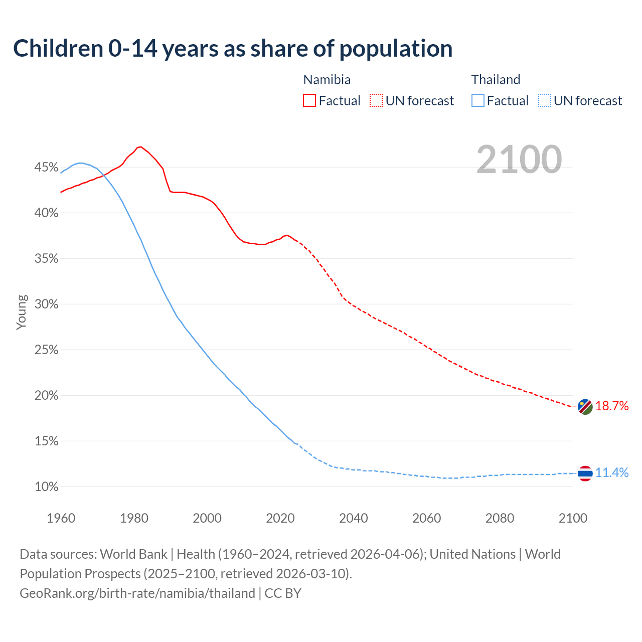 According to the latest available data on birth rates, the fertility rate in Namibia was 3.21 children per woman in 2023, compared to 1.21 in Thailand in 2023. The replacement level is considered to be 2.1 children per woman.