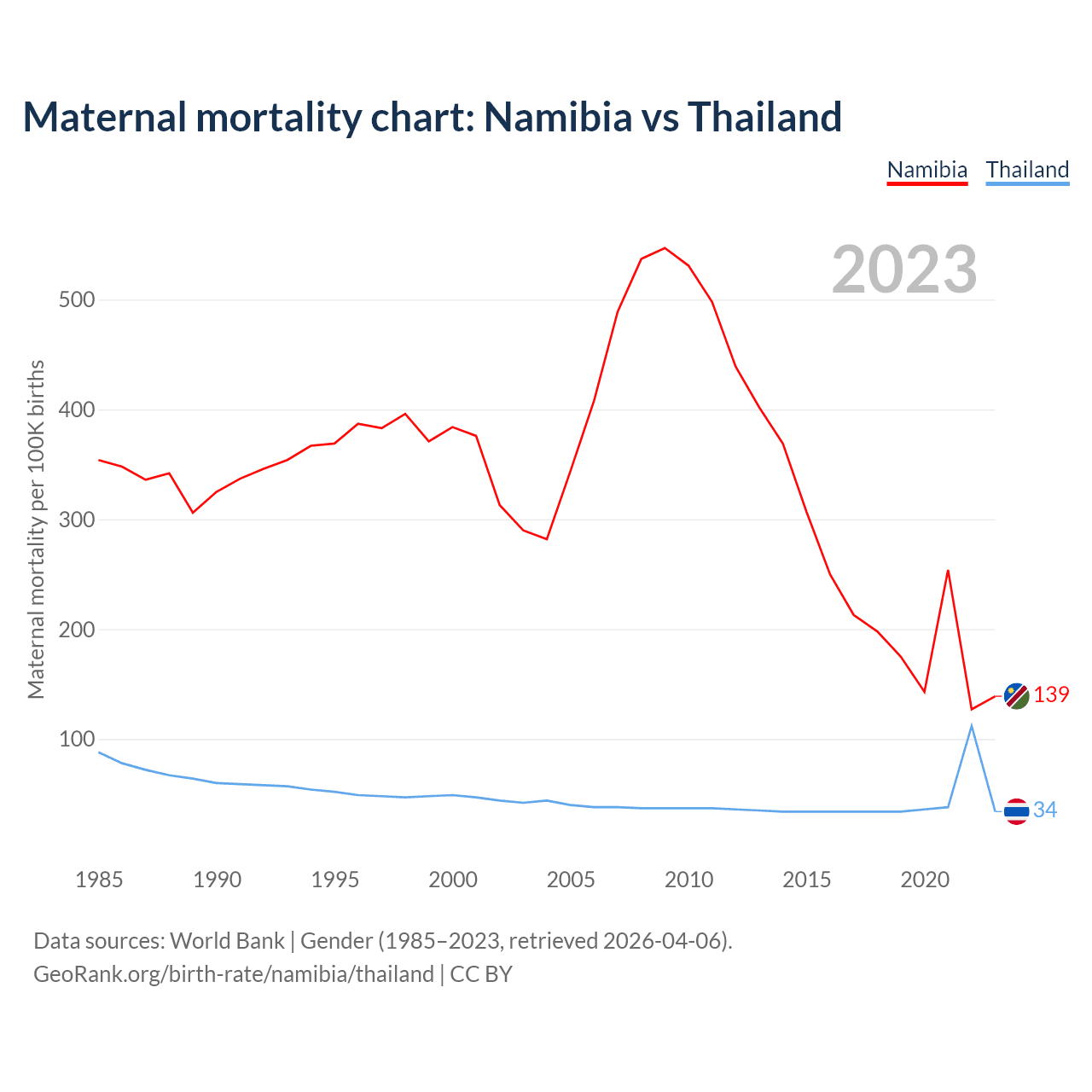 The maternal mortality rate, which is the probability of dying during childbirth or within 42 days of pregnancy termination, is 139 deaths per 100,000 live births in Namibia, compared to 34 deaths in Thailand.