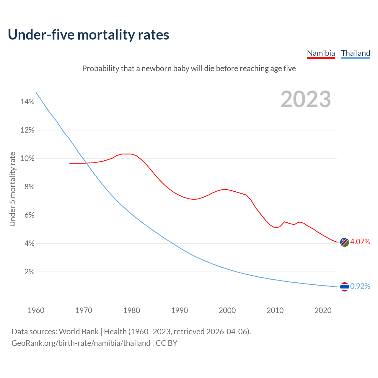 The chance that a newborn baby will die before reaching age five is 4.07% in Namibia and 0.92% in Thailand. Above is a chart with historical data on under-five mortality rates.