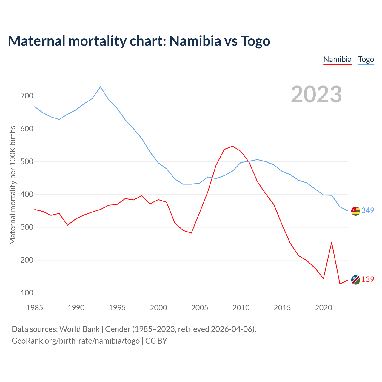 The maternal mortality rate, which is the probability of dying during childbirth or within 42 days of pregnancy termination, is 139 deaths per 100,000 live births in Namibia, compared to 349 deaths in Togo.