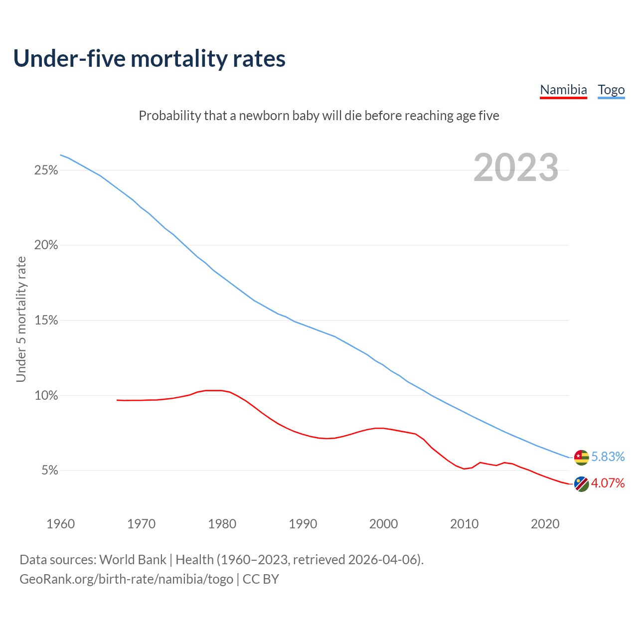 The chance that a newborn baby will die before reaching age five is 4.07% in Namibia and 5.83% in Togo. Above is a chart with historical data on under-five mortality rates.