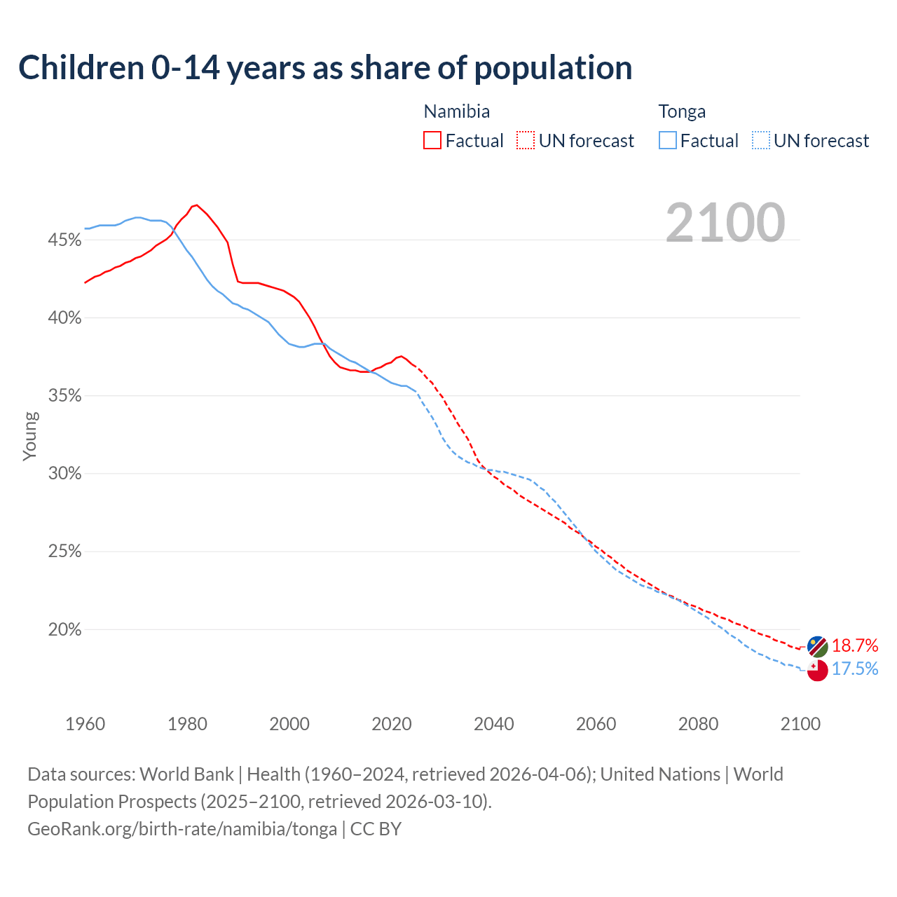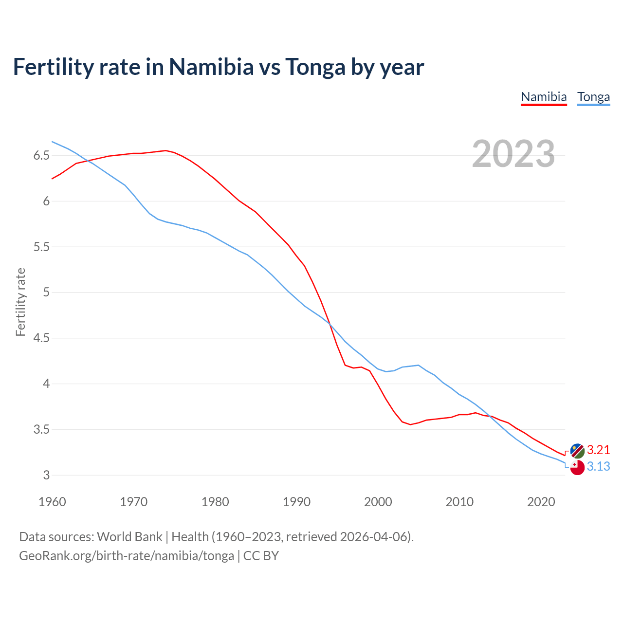 According to the latest available data on birth rates, the fertility rate in Namibia was 3.21 children per woman in 2023, compared to 3.13 in Tonga in 2023. The replacement level is considered to be 2.1 children per woman.
