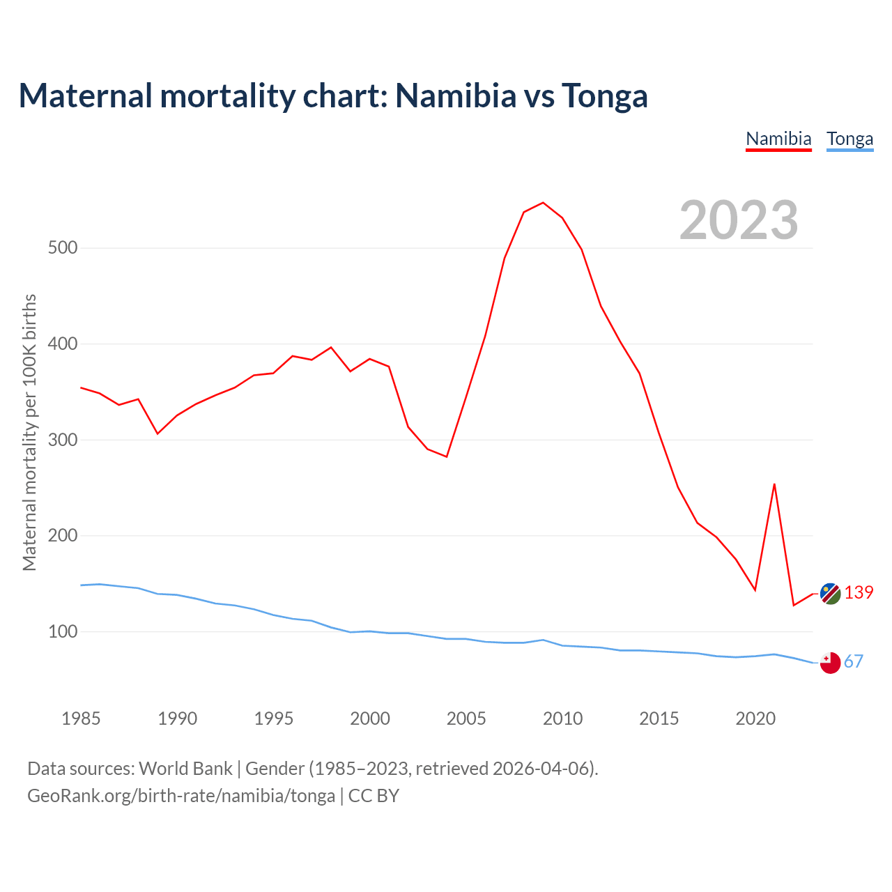 The maternal mortality rate, which is the probability of dying during childbirth or within 42 days of pregnancy termination, is 139 deaths per 100,000 live births in Namibia, compared to 67 deaths in Tonga.