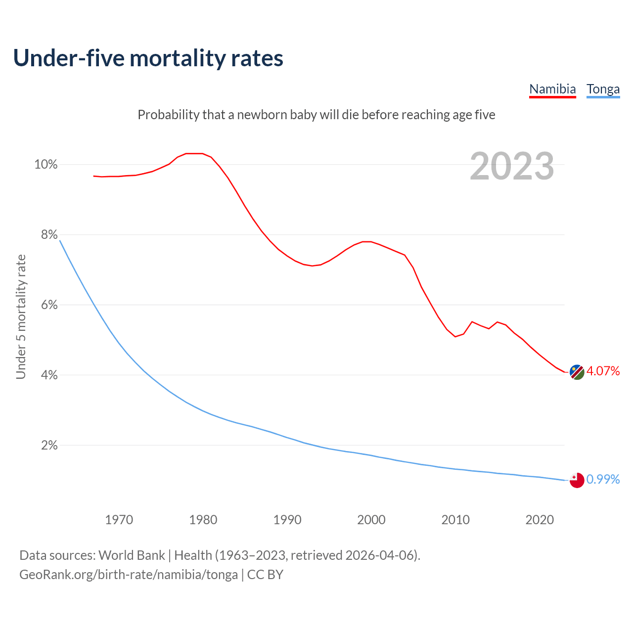 The chance that a newborn baby will die before reaching age five is 4.07% in Namibia and 0.99% in Tonga. Above is a chart with historical data on under-five mortality rates.