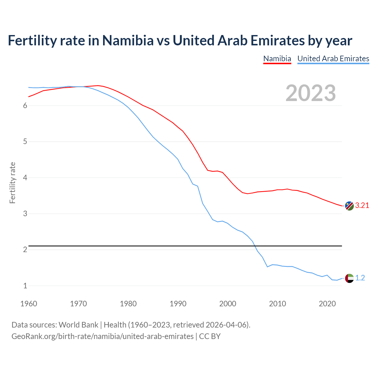 According to the latest available data on birth rates, the fertility rate in Namibia was 3.21 children per woman in 2023, compared to 1.2 in the United Arab Emirates in 2023. The replacement level is considered to be 2.1 children per woman.