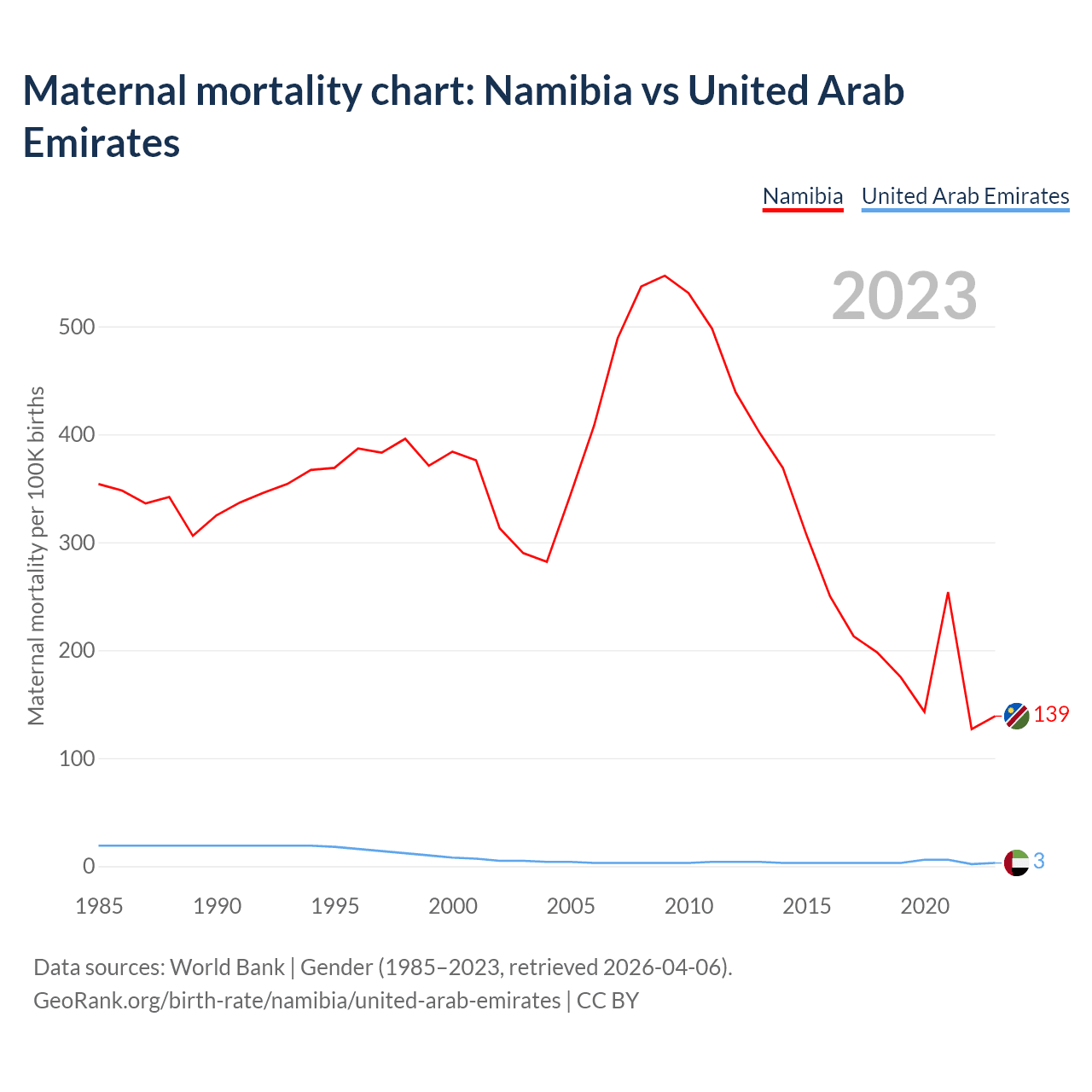 The maternal mortality rate, which is the probability of dying during childbirth or within 42 days of pregnancy termination, is 139 deaths per 100,000 live births in Namibia, compared to 3 deaths in the United Arab Emirates.