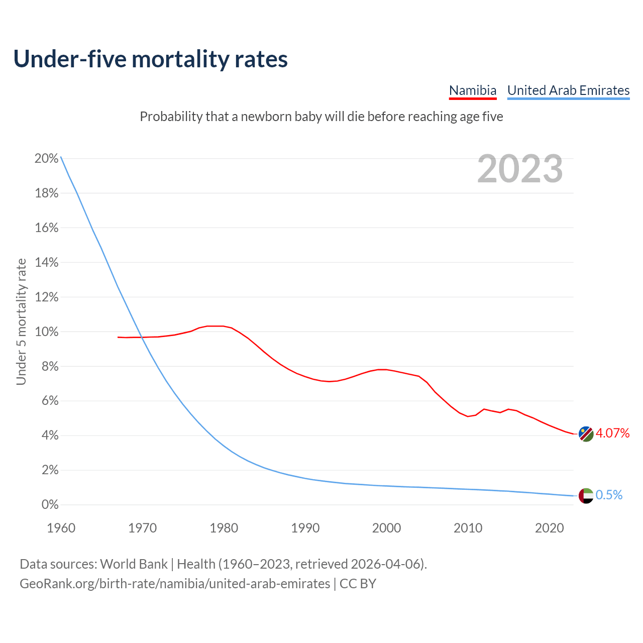 The chance that a newborn baby will die before reaching age five is 4.07% in Namibia and 0.5% in the United Arab Emirates. Above is a chart with historical data on under-five mortality rates.