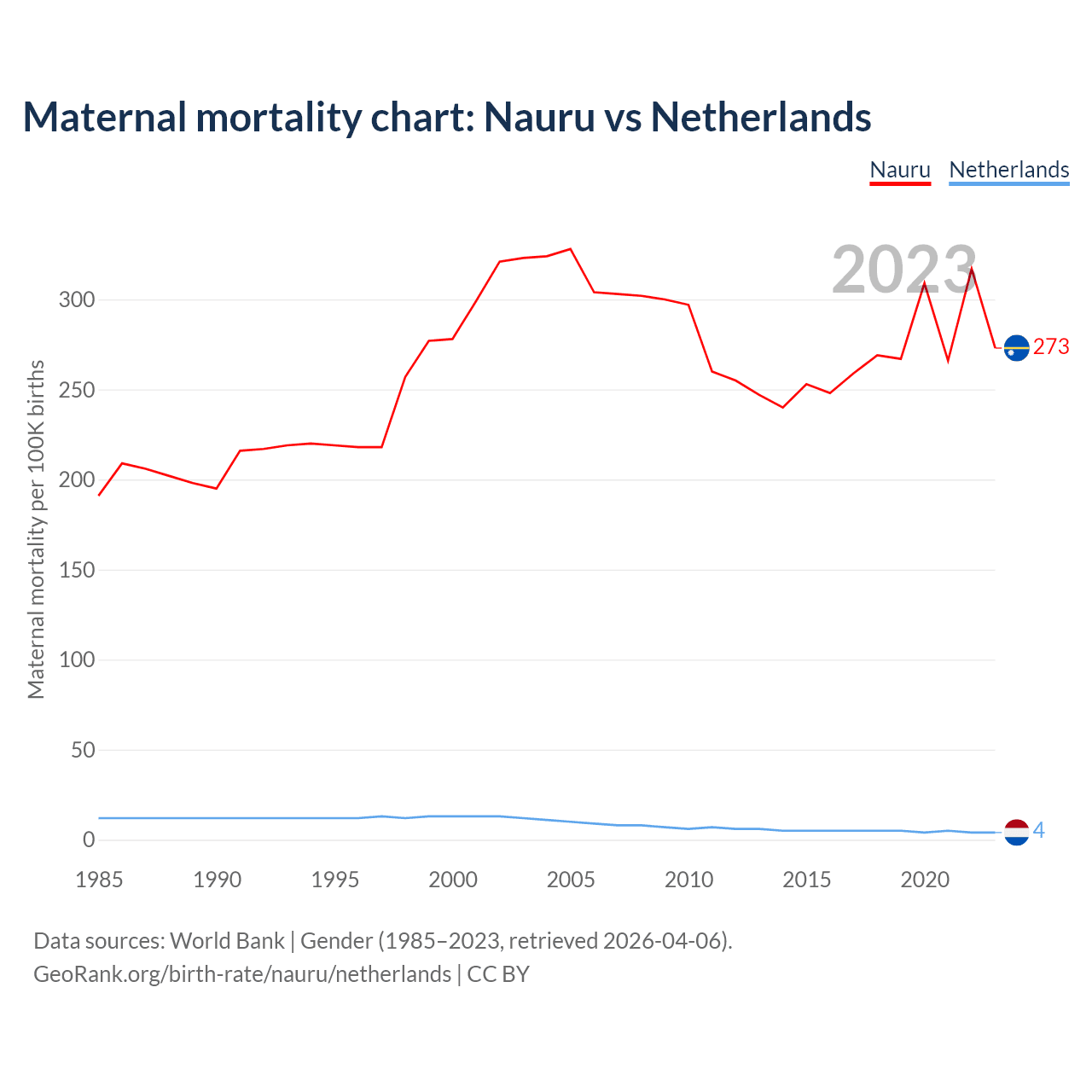 The maternal mortality rate, which is the probability of dying during childbirth or within 42 days of pregnancy termination, is 273 deaths per 100,000 live births in Nauru, compared to 4 deaths in the Netherlands.