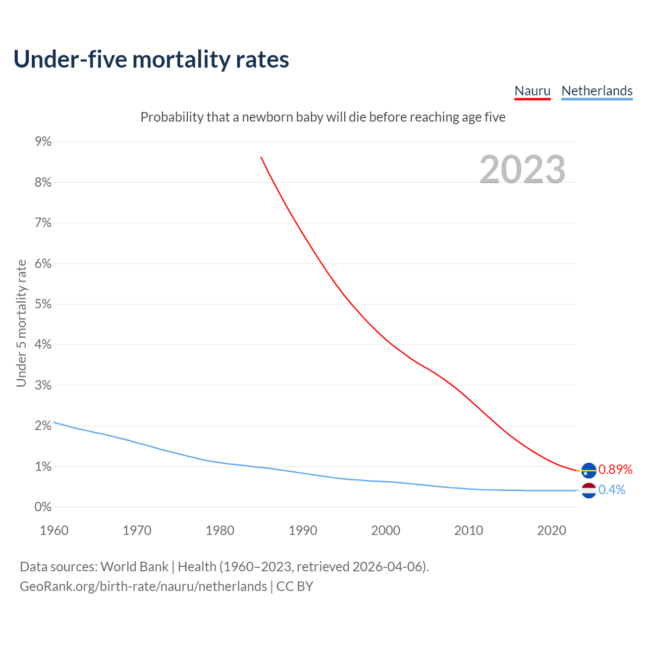 The chance that a newborn baby will die before reaching age five is 0.89% in Nauru and 0.4% in the Netherlands. Above is a chart with historical data on under-five mortality rates.