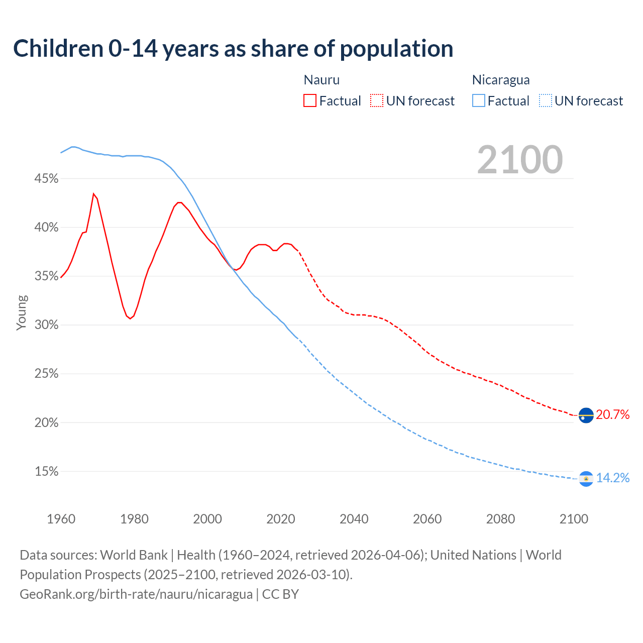 According to the latest available data on birth rates, the fertility rate in Nauru was 3.33 children per woman in 2023, compared to 2.22 in Nicaragua in 2023. The replacement level is considered to be 2.1 children per woman.