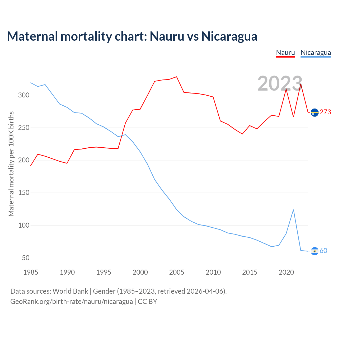 The maternal mortality rate, which is the probability of dying during childbirth or within 42 days of pregnancy termination, is 273 deaths per 100,000 live births in Nauru, compared to 60 deaths in Nicaragua.