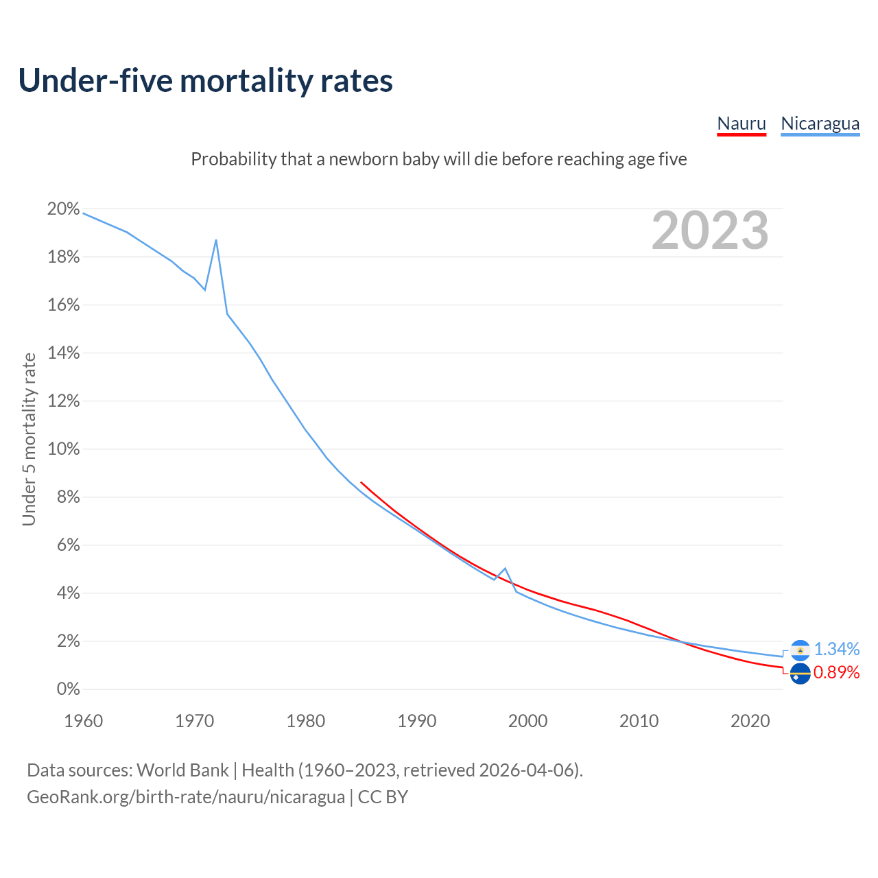 The chance that a newborn baby will die before reaching age five is 0.89% in Nauru and 1.34% in Nicaragua. Above is a chart with historical data on under-five mortality rates.