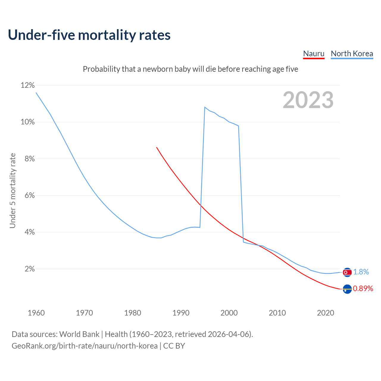 The chance that a newborn baby will die before reaching age five is 0.89% in Nauru and 1.8% in North Korea. Above is a chart with historical data on under-five mortality rates.