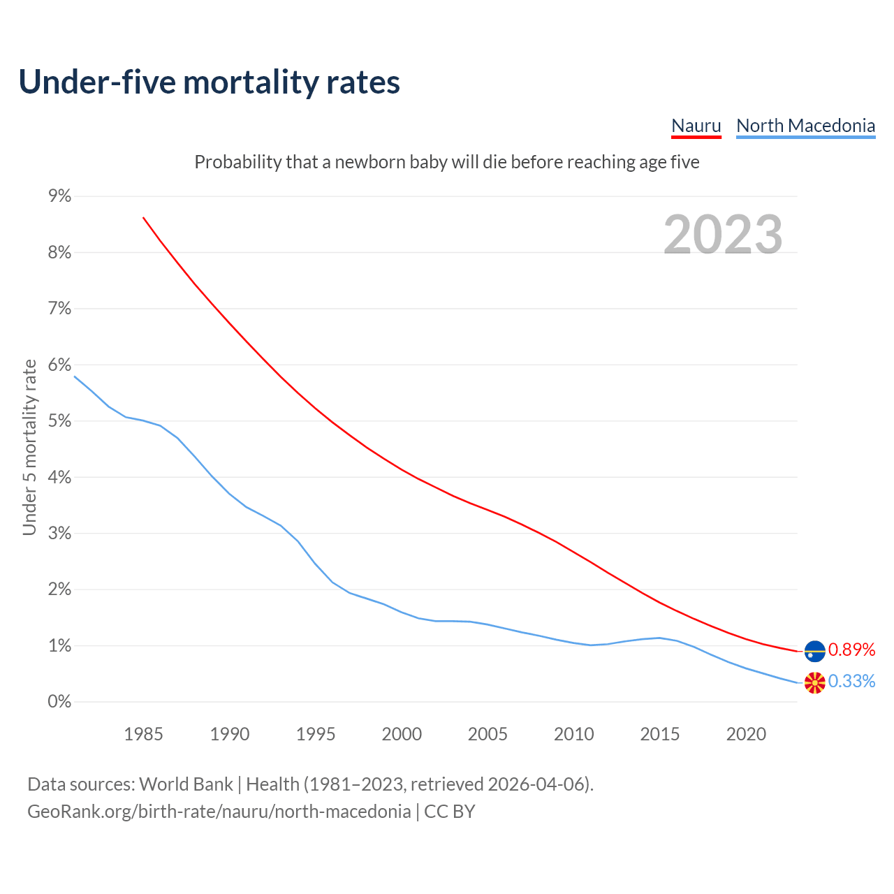 The chance that a newborn baby will die before reaching age five is 0.89% in Nauru and 0.33% in North Macedonia. Above is a chart with historical data on under-five mortality rates.