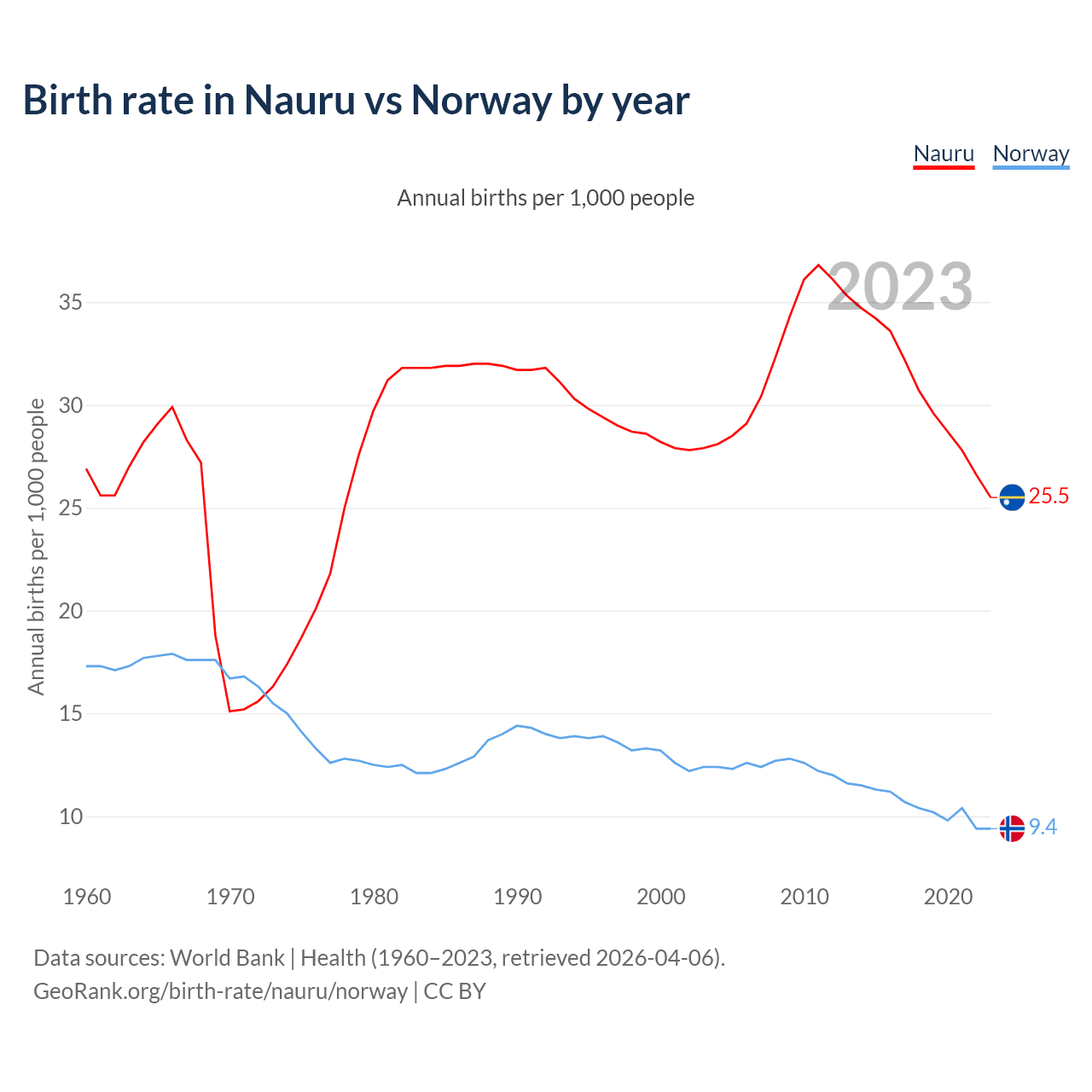 Nauru has an annual birth rate of 25.5 births per 1,000 people, compared to 9.4 for Norway. The average number of children a woman is expected to have during her lifetime — the fertility rate, is 3.33 in Nauru and 1.4 in Norway — 58% difference.