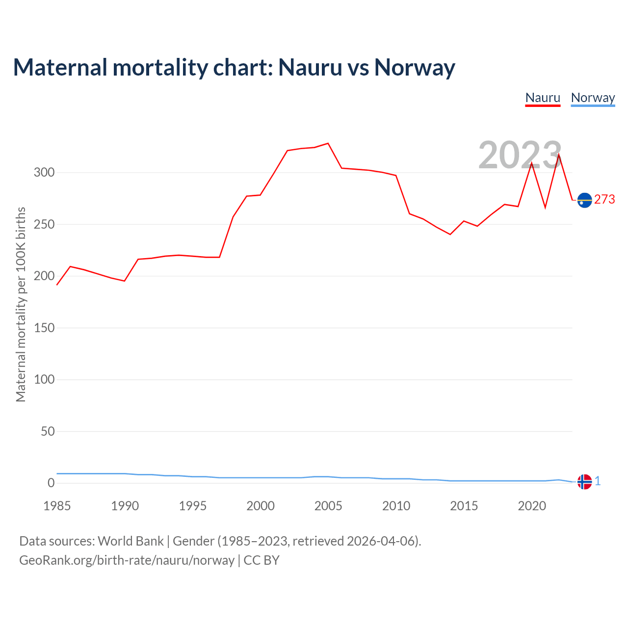 The maternal mortality rate, which is the probability of dying during childbirth or within 42 days of pregnancy termination, is 273 deaths per 100,000 live births in Nauru, compared to 1 deaths in Norway.