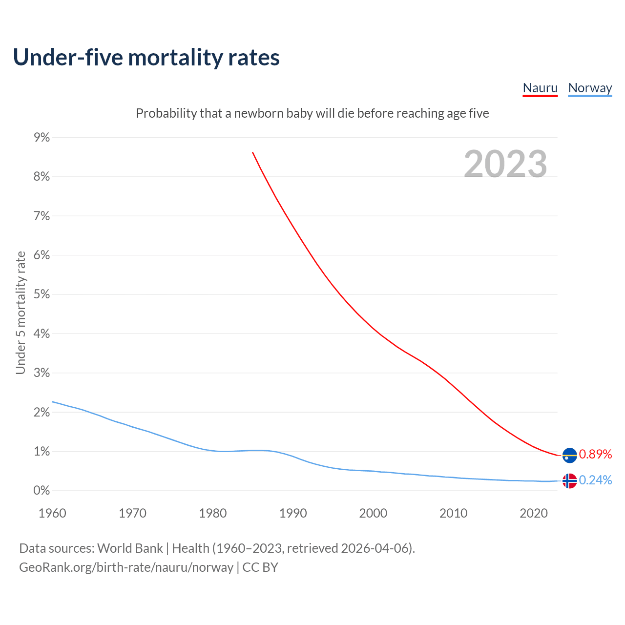 The chance that a newborn baby will die before reaching age five is 0.89% in Nauru and 0.24% in Norway. Above is a chart with historical data on under-five mortality rates.