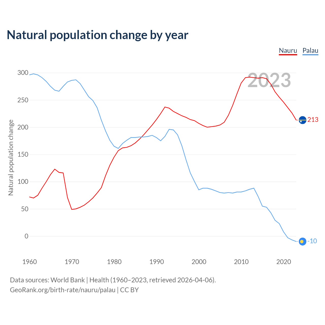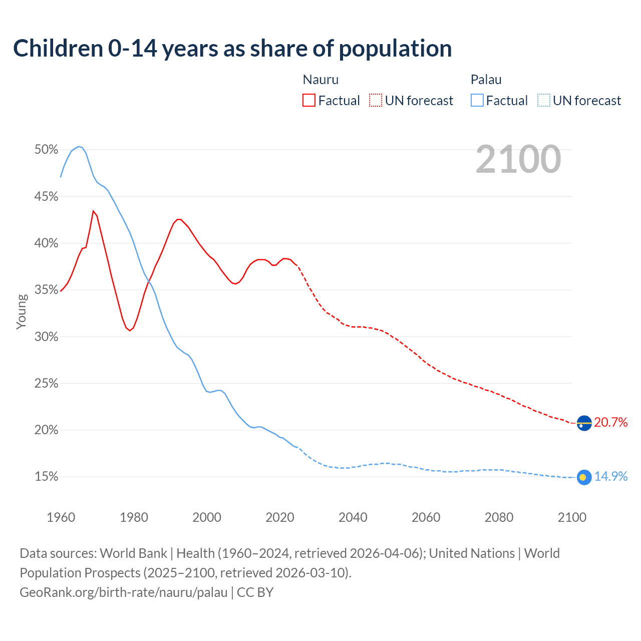 According to the latest available data on birth rates, the fertility rate in Nauru was 3.33 children per woman in 2023, compared to 1.91 in Palau in 2023. The replacement level is considered to be 2.1 children per woman.