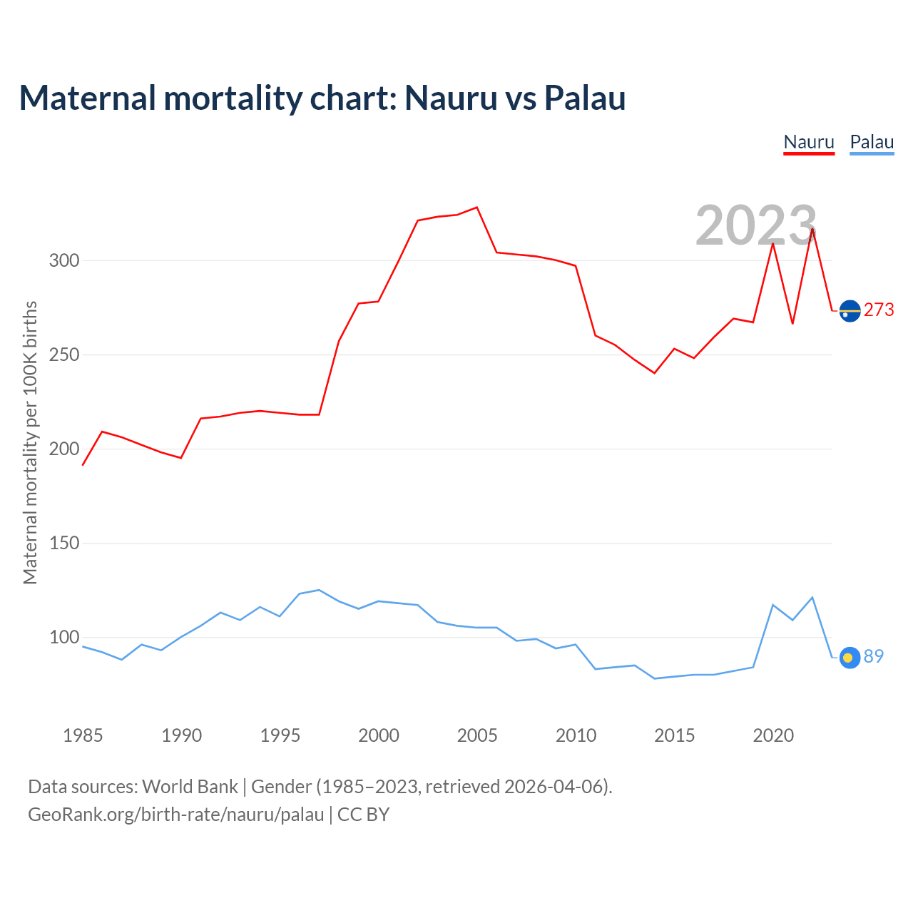 The maternal mortality rate, which is the probability of dying during childbirth or within 42 days of pregnancy termination, is 273 deaths per 100,000 live births in Nauru, compared to 89 deaths in Palau.