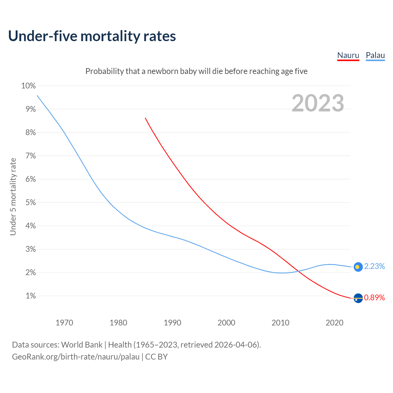 The chance that a newborn baby will die before reaching age five is 0.89% in Nauru and 2.23% in Palau. Above is a chart with historical data on under-five mortality rates.