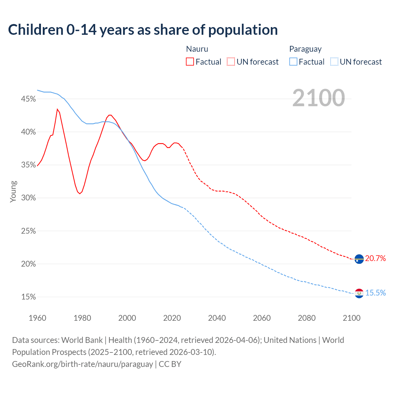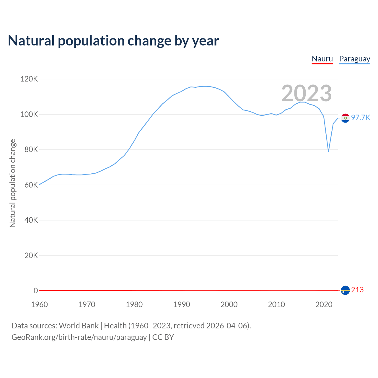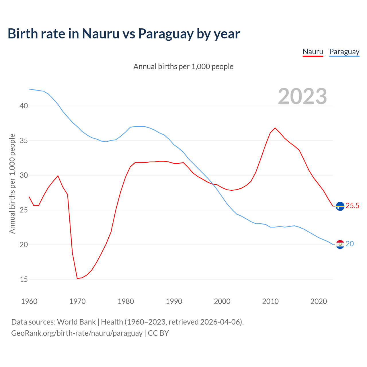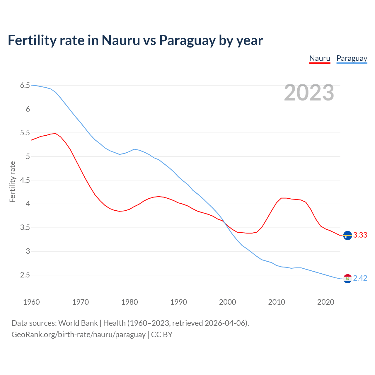 According to the latest available data on birth rates, the fertility rate in Nauru was 3.33 children per woman in 2023, compared to 2.42 in Paraguay in 2023. The replacement level is considered to be 2.1 children per woman.
