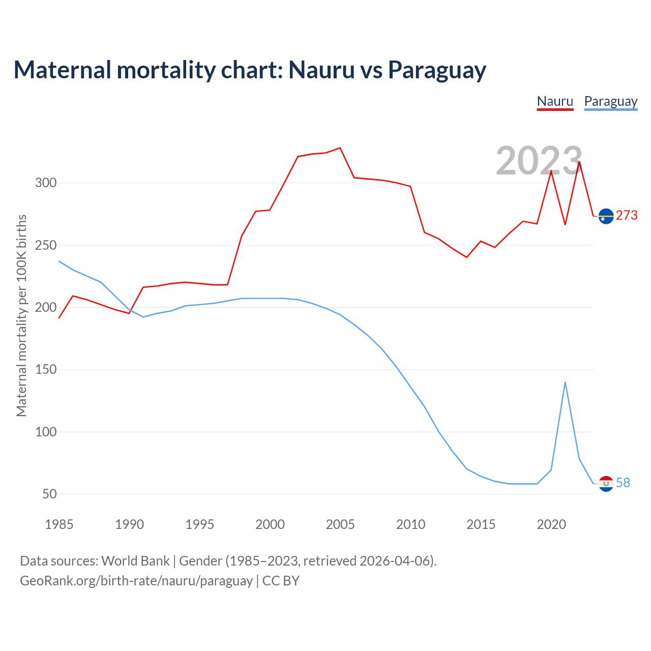 The maternal mortality rate, which is the probability of dying during childbirth or within 42 days of pregnancy termination, is 273 deaths per 100,000 live births in Nauru, compared to 58 deaths in Paraguay.