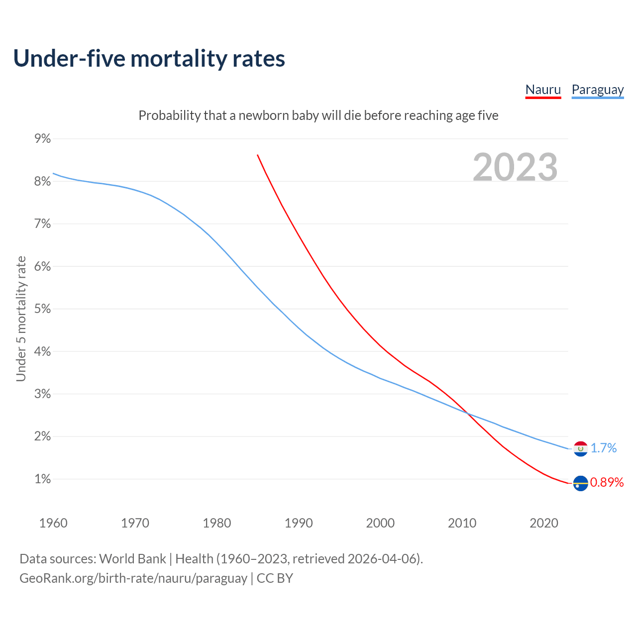 The chance that a newborn baby will die before reaching age five is 0.89% in Nauru and 1.7% in Paraguay. Above is a chart with historical data on under-five mortality rates.