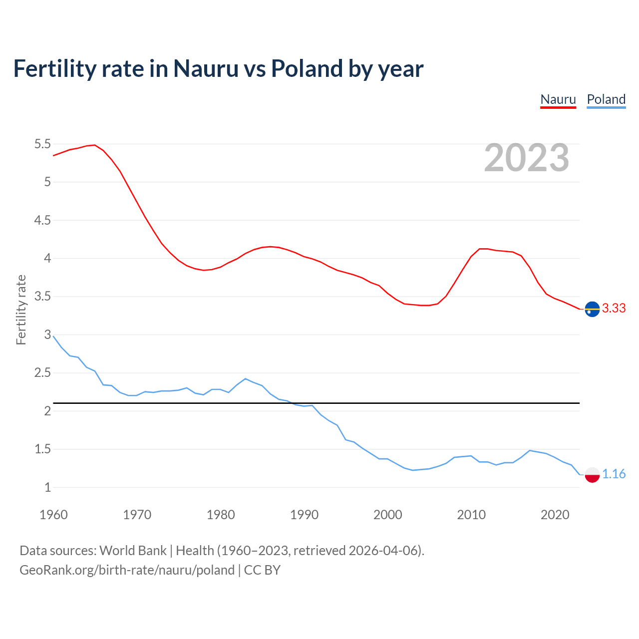 Nauru has an annual birth rate of 25.5 births per 1,000 people, compared to 7.4 for Poland. The average number of children a woman is expected to have during her lifetime — the fertility rate, is 3.33 in Nauru and 1.16 in Poland — 65.2% difference.