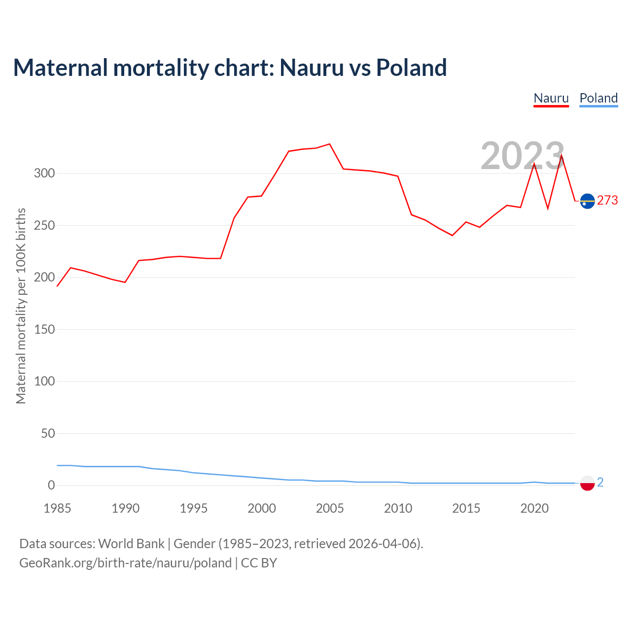 The maternal mortality rate, which is the probability of dying during childbirth or within 42 days of pregnancy termination, is 273 deaths per 100,000 live births in Nauru, compared to 2 deaths in Poland.