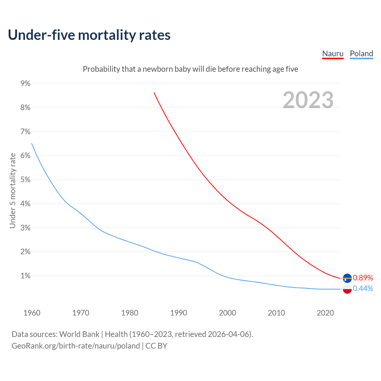 The chance that a newborn baby will die before reaching age five is 0.89% in Nauru and 0.44% in Poland. Above is a chart with historical data on under-five mortality rates.