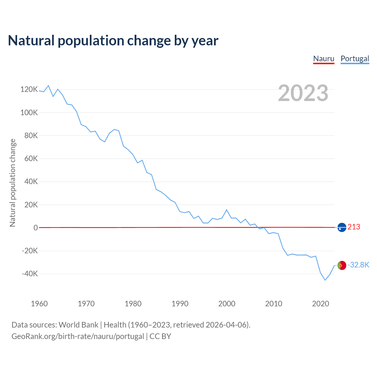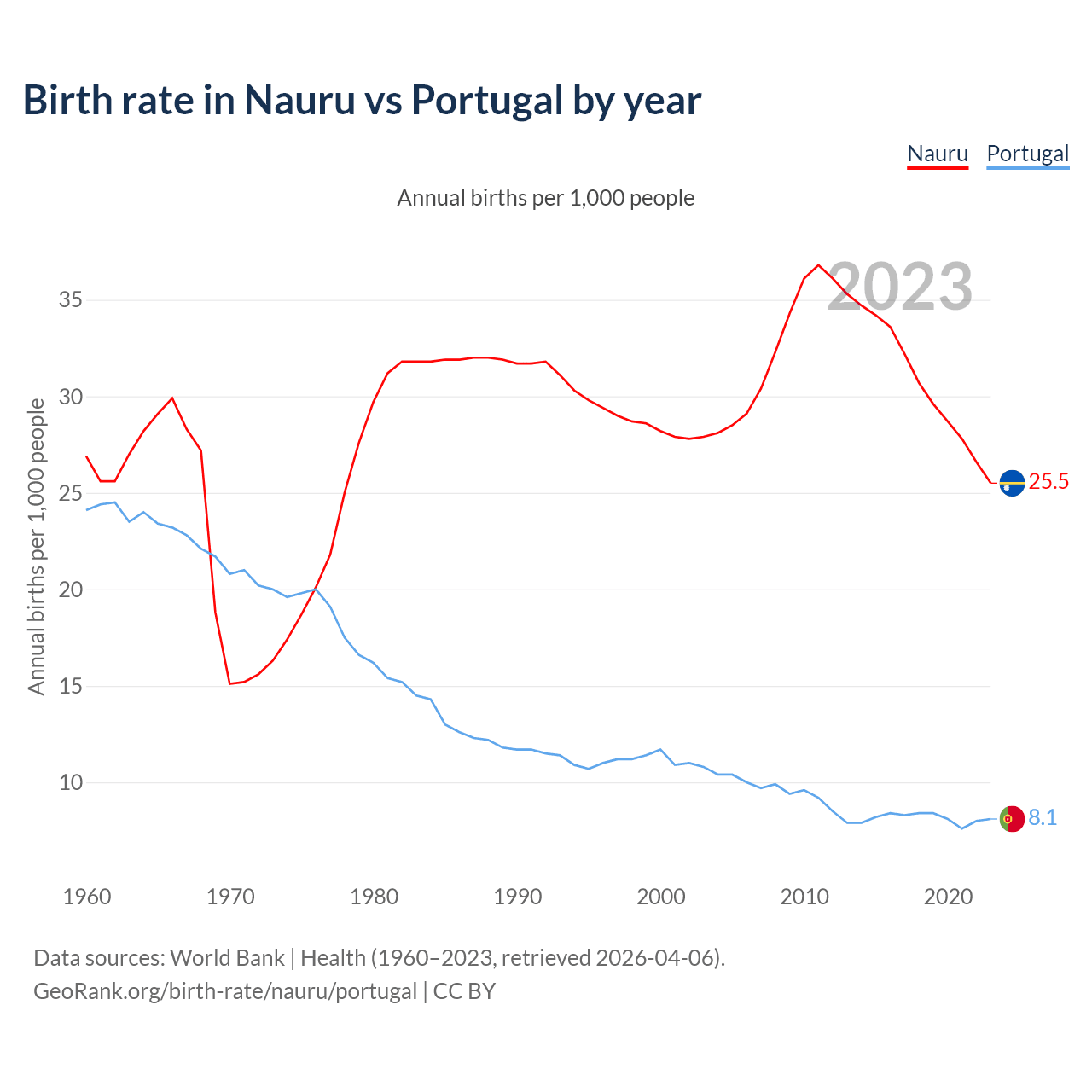 Nauru has an annual birth rate of 25.5 births per 1,000 people, compared to 8.1 for Portugal. The average number of children a woman is expected to have during her lifetime — the fertility rate, is 3.33 in Nauru and 1.44 in Portugal — 56.8% difference.