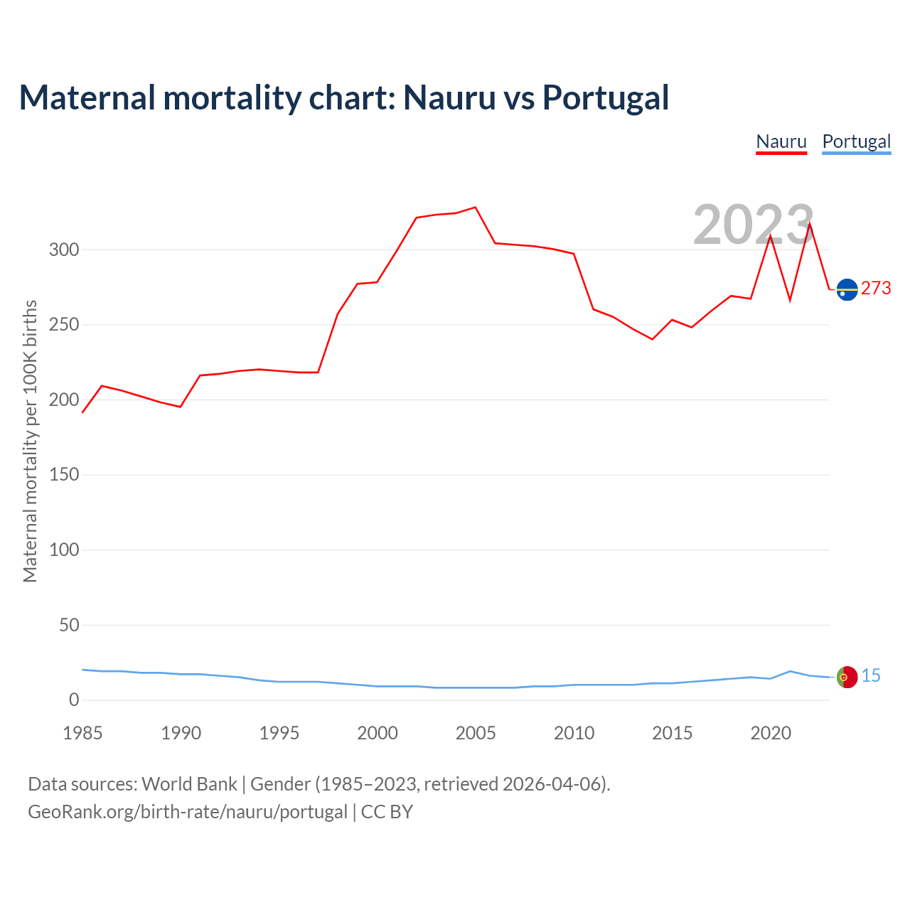 The maternal mortality rate, which is the probability of dying during childbirth or within 42 days of pregnancy termination, is 273 deaths per 100,000 live births in Nauru, compared to 15 deaths in Portugal.