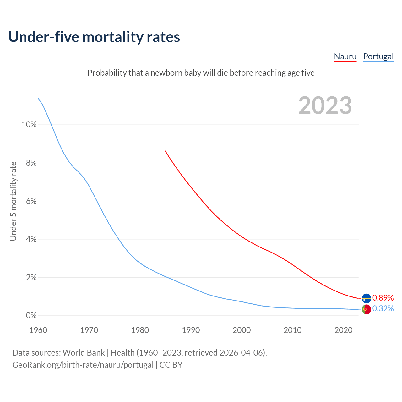 The chance that a newborn baby will die before reaching age five is 0.89% in Nauru and 0.32% in Portugal. Above is a chart with historical data on under-five mortality rates.